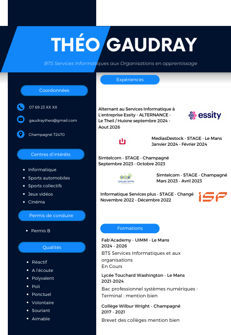 Je m’appelle Théo Gaudray, j’ai 19 ans et je suis un alternant Technicien Systèmes et réseaux à l’entreprise Essity au Theil/Huisne et en formations à la Fab’Academy au Mans.